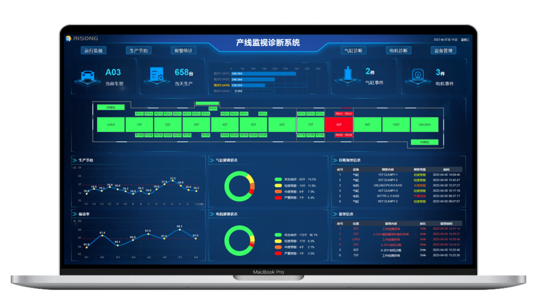 RIDP平臺上的產(chǎn)線運行監(jiān)視系統(tǒng),可以監(jiān)控產(chǎn)線整體運行狀態(tài),實現(xiàn)故障實時告警,對工序步驟進行緊密監(jiān)視及數(shù)據(jù)回傳,以快速進行故障定位和修復(fù)。該系統(tǒng)也可實時了解生產(chǎn)節(jié)拍、統(tǒng)計車型、產(chǎn)量、稼動率、故障時間等生產(chǎn)數(shù)據(jù),消除信息時間差,針對性進行生產(chǎn)節(jié)拍優(yōu)化,提高產(chǎn)線效率。