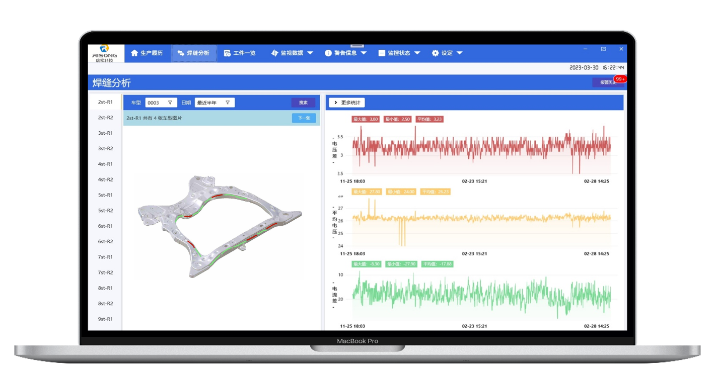 RIDP平臺上的焊接質(zhì)量管理系統(tǒng),利用服務(wù)器對機器人、機器人控制器和產(chǎn)線PLC的信息進行收集,并建立數(shù)據(jù)庫,可視化的呈現(xiàn)給用戶,用戶可以根據(jù)這些信息,和預(yù)先訓(xùn)練好的AI模型,進行焊接參數(shù)制定、焊接參數(shù)下發(fā)、焊接執(zhí)行、質(zhì)量預(yù)測等焊接工作,對焊接良品的上下限電阻閾值進行科學(xué)智能的設(shè)置,以及實時預(yù)警。該系統(tǒng)可對弧焊、點焊等多種焊接工藝進行數(shù)據(jù)監(jiān)視和數(shù)據(jù)追溯,便于分析利用,有效降低生產(chǎn)成本,提升焊接良品率。